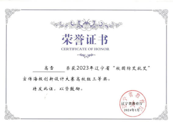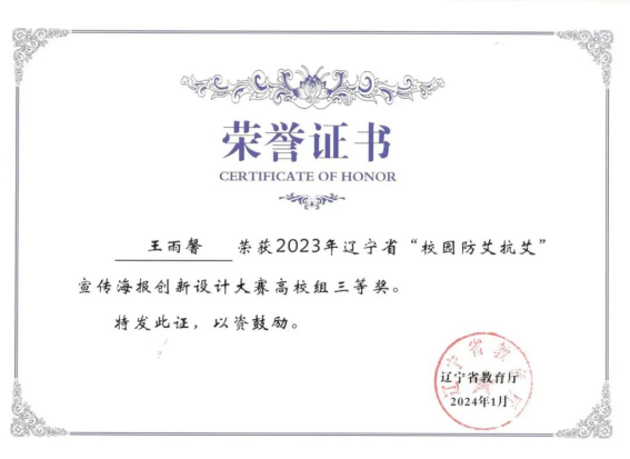 近日,由辽宁省教育厅举办的2023年“校园防艾抗艾”宣传海报创新设计大赛评选结果揭晓。我校两位同学的作品荣获高校组三等奖。
